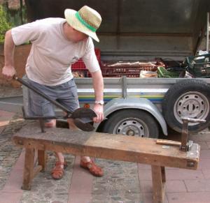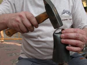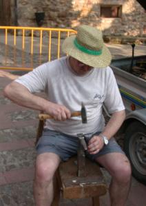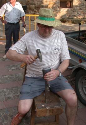 Cuando cuece, aprovechando que el horno esta encendido, calienta unas chapas previamente preparadas, para dar el bombeo a los pedreños – esquilas abombadas en la parte superior – con un martillo especial. Como una chapa sola es demasiado fina para moldearla al fuego, el artesano trabaja con dos piezas a la vez.