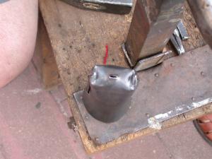 El moldeado de la pieza termina con el pliegue de las orejas que sujetaran el ansa de afuera. Con un puntero marca los puntos para los remaches en las dos juntas de cierre de la chapa. Taladrados los agujeros por sus marcas, une las juntas con remaches de hierro.